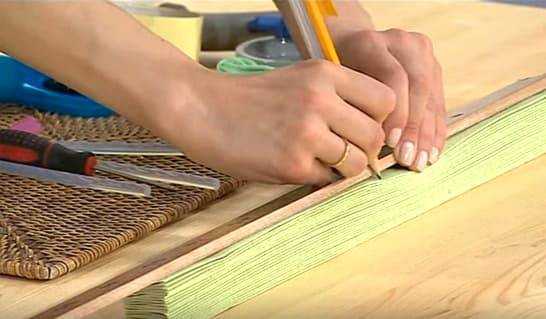 После этого приступают к раскрою полотна. Обои раскладывают на ровной поверхности – это может быть большой обеденный стол или пол, переносят на них чертеж в натуральном масштабе, все тщательно проверяют с помощью рулетки и при необходимости вносят коррективы.