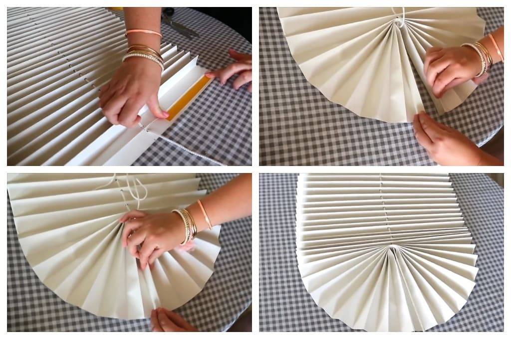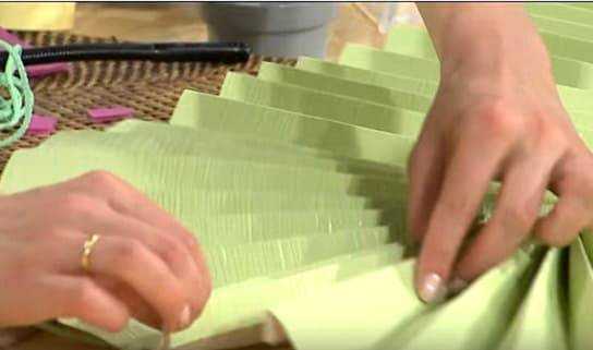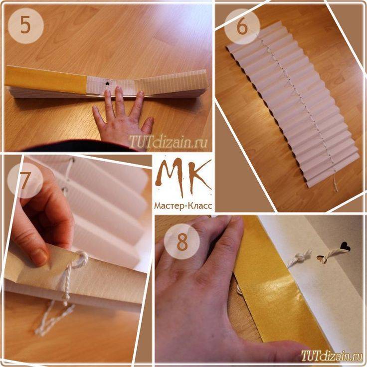 Чтобы сделать жалюзи из обоев, вырезанную заготовку складывают в гармошку. Оптимальная ширина складок при этом должна быть в диапазоне от трех до пяти сантиметров. Если превысить эти нормы, результат проиграет по внешнему виду. Далее на полученной «гармошке» из обоев отмеряют середину и проделывают отверстия для шнура. Их укрепляют скотчем для того, чтобы избежать разрыва полотна в процессе интенсивной эксплуатации аксессуара.