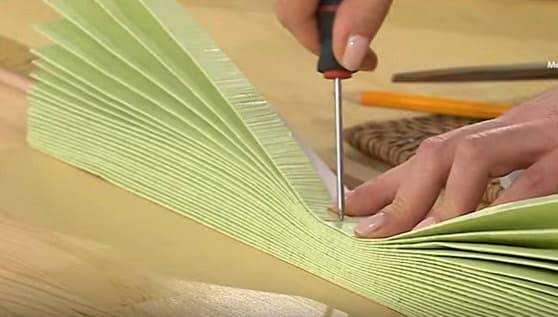 Отверстия в таком случае проделывают с обеих сторон бумажной «гармошки», отмеряя одинаковое расстояние от края полотна с помощью линейки.
