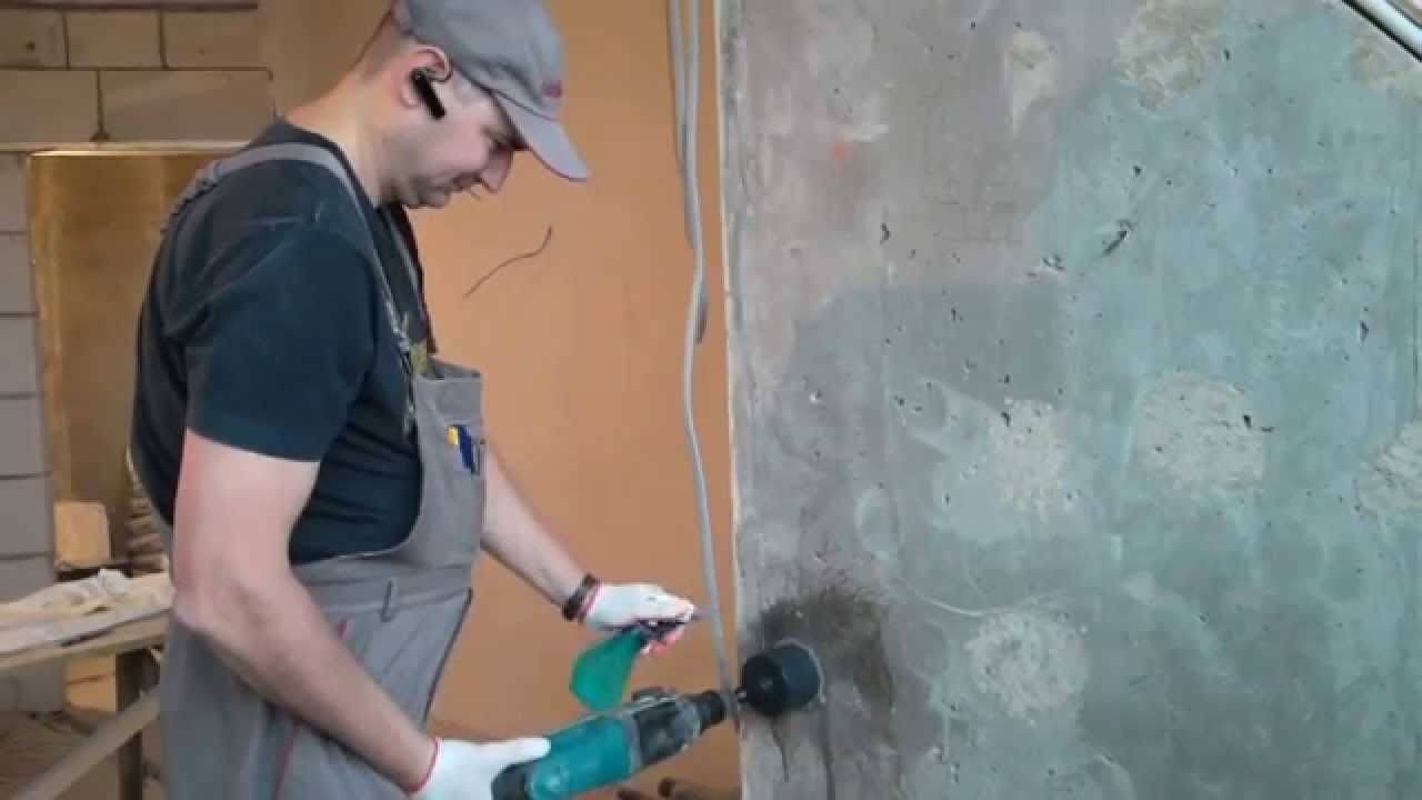 Сверление отверстия в бетоне производится ударной дрелью или перфоратором, инструмент позволяет просверлить каналы глубиной до 500 мм. Недостатками применения оборудования являются повышенный шум при работе и риск разрушения стены из-за вибрационных нагрузок.