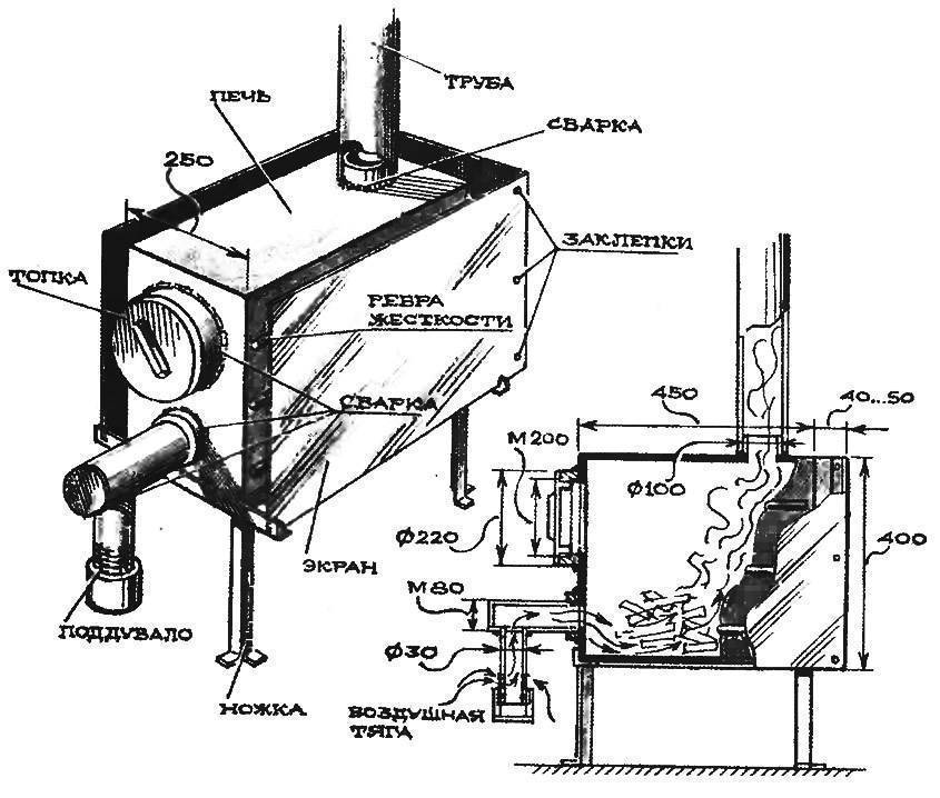 На схеме нужно обозначить все точные замеры Дымоход должен выводиться обязательно на улицу Буржуйка может быть круглой или квадратной Объём топки зависит от наличия колосников Схема буржуйки зависит от используемого материала