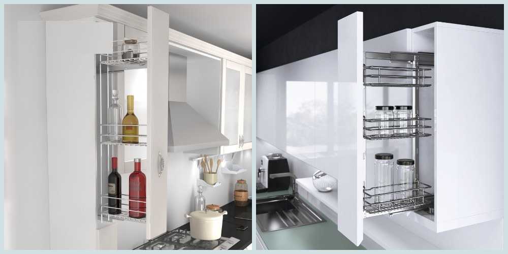 Для более надежного крепления на полках большинства бутылочниц имеется возможность установки дополнительных разделителей, обеспечивающих надежную фиксацию кухонных аксессуаров, и исключающих их опрокидывание при открывании дверки (для навешиваемых образцов) или при резком выдвижении изделий имеющих ролики или смонтированных на роликовых полозьях.