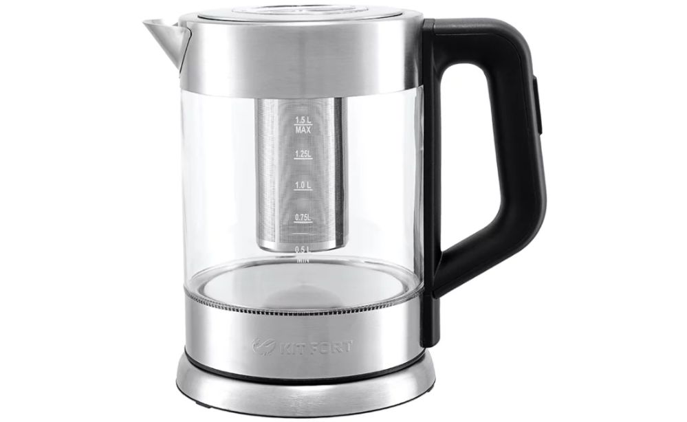 Продолжает наш рейтинг электрический заварник Kitfort КТ-623. Эта модель впечатляет своим функционалом, при помощи которого вы сможете не только вскипятить воду, но и довести ее до нужной температуры. Для этого на ручке прибора предусмотрен регулятор, благодаря которому можно выбрать наиболее предпочтительную температуру нагрева воды: 40, 70, 80, 90 или 100 градусов. Также возможности данной модели включают в себя поддержание температуры воды, в результате чего вам не придется повторно нагревать воду: она останется горячей. Для контроля температуры воды китфорт чайник на дне имеет термодатчик. Для изготовления корпуса электрочайника использовалось закаленное стекло, способное выдержать температуру кипения воды. Прозрачный резервуар для воды гармонично сочетается с серебристыми и черными вставками на ручке, крышке и подставке. Благодаря мерной шкале вы всегда будете проинформированы об оставшемся объеме воды в чайнике. За счет большого горлышка облегчается процесс мытья резервуара изнутри. Объем представленной модели равен 1.5 л, мощность достигает показателя 2200 Вт.
