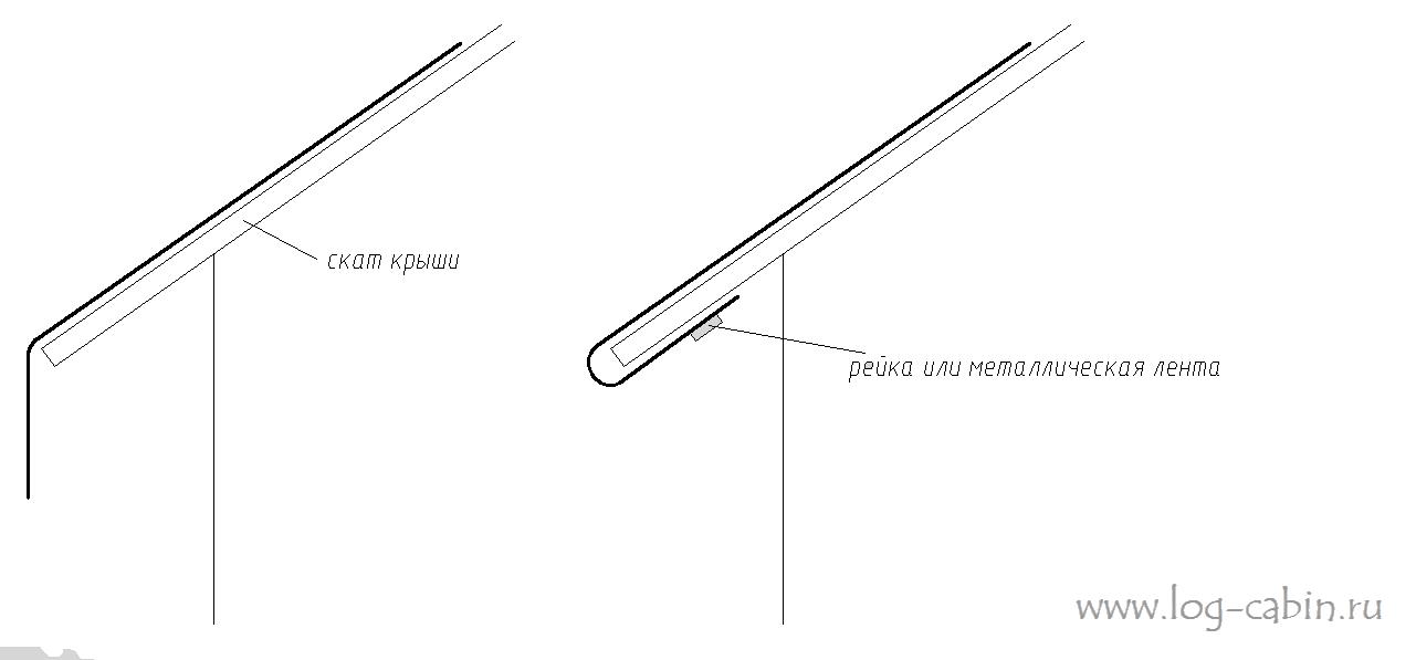 Не менее 10 см войлока сворачивается под карнизом и крепится к краям обрешетки гвоздями или металлическими полосами.