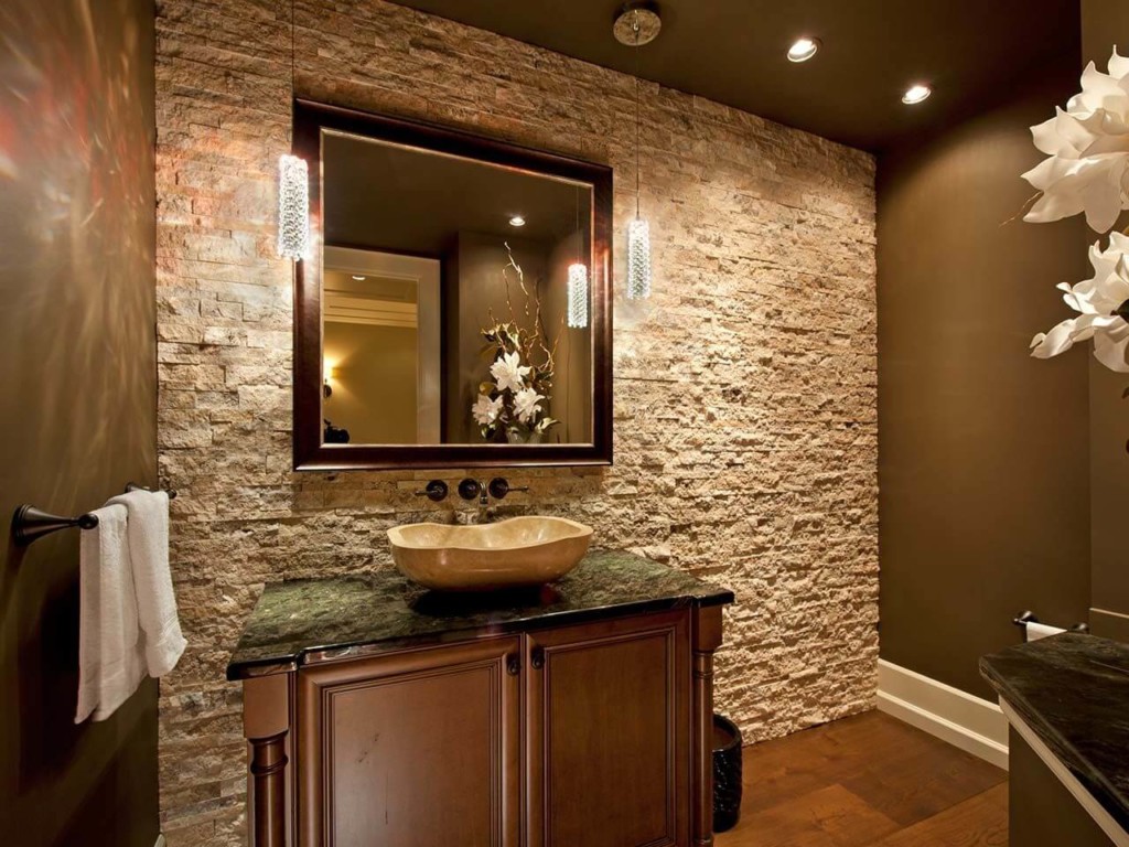 Камень прекрасно подходит для выделения акцентной стены в интерьере ванной