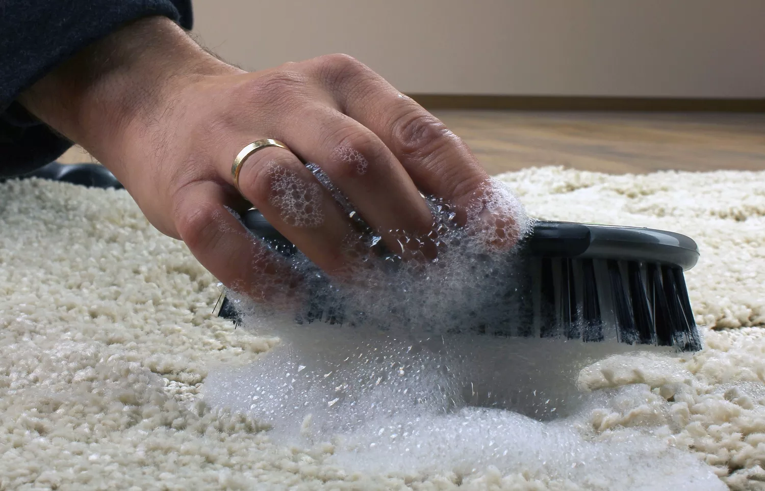 Ковролин и другие мягкие покрытия c ворсом прочно сцепляются с пеной. Шапку можно срезать только после полного застывания. Пятно замачивают на 2–3 часа водой, пытаются понемногу удалять жёсткой щёткой или скребками.