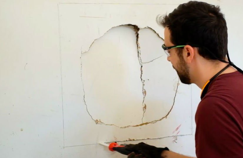 - С поверхности удаляется вся старая отделка — обои, плитка и штукатурка. Расчищаются швы между потолочными плитами и стеновыми панелями. Проводится их заделка цементным раствором.