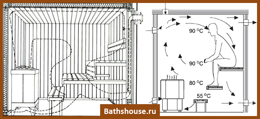 В парилке преимущественно устанавливается каменка, составляющая основу вентсистемы, т. е. воздушные потоки из помещения проходят через источник тепла.