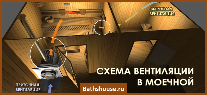Для помещения, предназначенного для мытья, характерна высокая влажность, способствующая появлению грибка на поверхностях из дерева. Учитывая, что вода скапливается преимущественно под полом, мастера советуют установить асбестовую трубу, которая будет идти из-под него на крышу, причем на выходе оснащаться дефлектором. Дополнительно можно сделать небольшое окно с открывающейся форточкой либо отдушину у потолка.