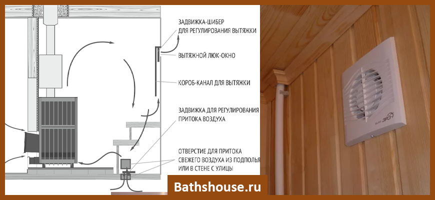 Для вентиляции пространства можно сделать отверстие у потолка и проветривать комнату при открытых дверях. Эффективным методом считается монтаж принудительной системы, т. е. установка вентилятора на отдушинах.