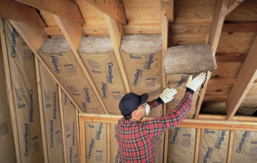 - Следующим этапом будет установка теплоизоляционного слоя. Лучшим выбором для создания этого слоя будет минеральная вата. Утеплитель нарезают на куски необходимого размера, вставляют между брусками, а затем закрепляют их пластиковыми дюбелями.