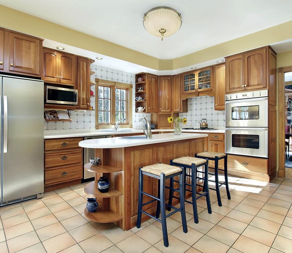 Сложно представить кухню без полок и шкафов. Представьте себе, что посуда стояла бы на полу. Поэтому, мебель тоже входит в список того, что нужно для новой кухни.Постарайтесь правильно расставить мебель в кухне. Гарнитур должен быть спроектирован таким образом, чтобы было удобно хозяйке
