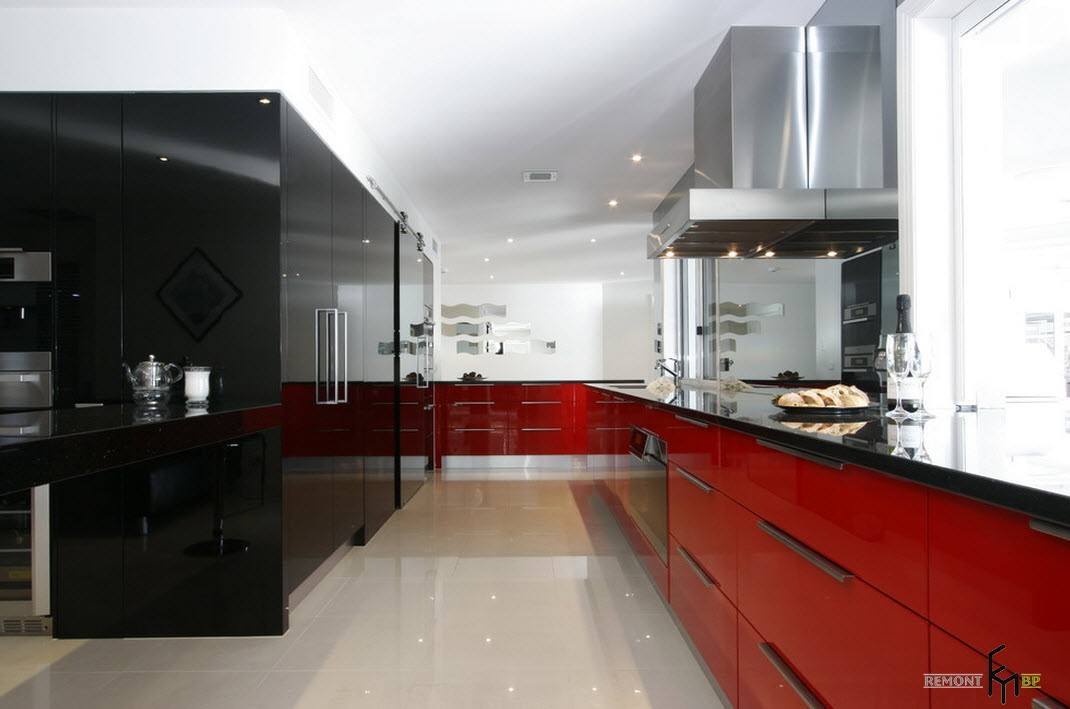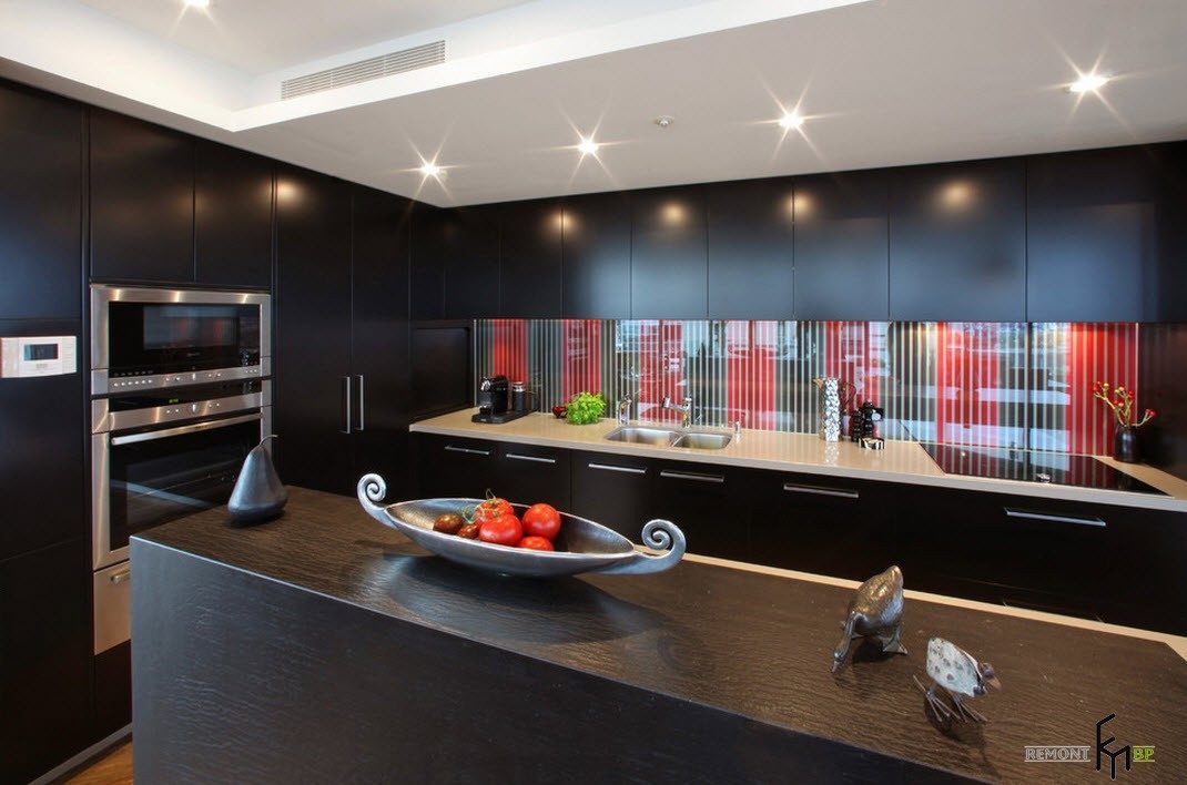 Красиво будет смотреться черный стол на ножках из металла, с черной, тонированной столешницей из стекла. Можно разбавить интерьер яркими однотонными деталями и аксессуарами. Фасады кухонь чаще всего делаются глянцевыми, блестящими, а потолок лучше всего подойдет натяжной.