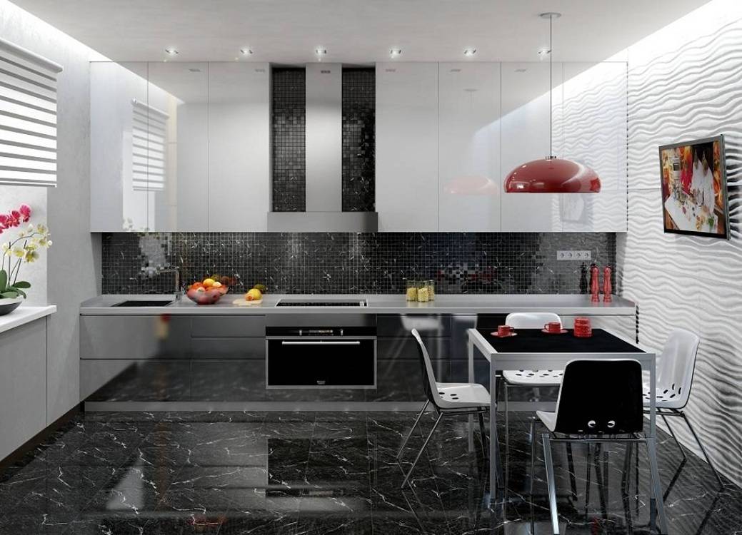 В качестве отделочного материала для стен чёрно-белой кухни рекомендуется использовать декоративную штукатурку, однотонные обои или краску. Поверхность стен может переливаться, блестеть. Если хозяева не любят однотонность, то на одну из стен можно наклеить обои с рисунком. Желательно, чтобы эта стена находилась напротив гарнитура. Фото чёрно-белой кухни в современном интерьере представлены ниже.
