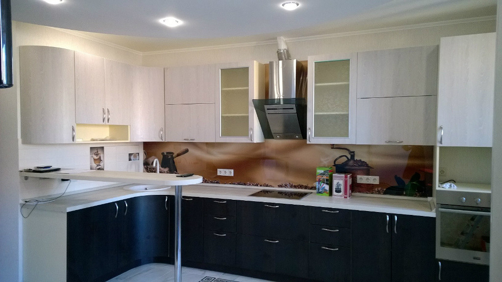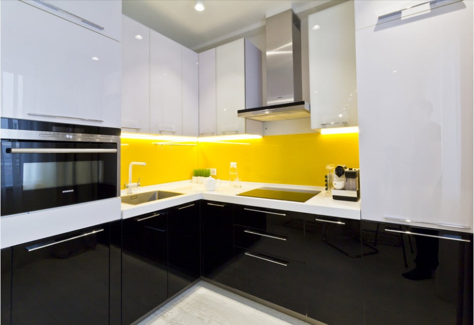 Для отделки фартука рекомендуется использовать керамическую плитку или жаропрочное стекло. Однотонная поверхность белого или чёрного цвета — универсальный вариант. Выделить фартук можно при помощи фотопечати. Самые подходящие сюжеты изображений для чёрно-белой кухни: