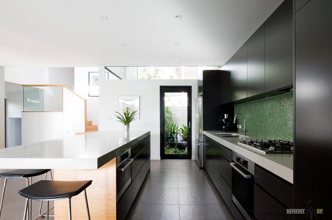 И снова зеленый фартук, но в виде мозаичной плитки на фоне матовых черных шкафов, которые соседствуют с белоснежными глянцевыми столешницами.