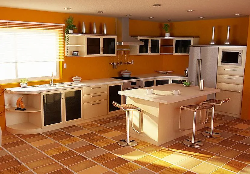 Пол подчеркивает интенсивность яркой палитры. В кухне гармонично смотрится светлая древесина, керамика и напольная мозаика. Смелым решением станет черные ламели на фоне тыквенных фасадов. Оригинально выглядит наливной вариант в сочном мандариновом цвете или плитка-шахматка.