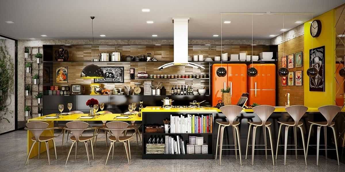 Стильное оформление кухонного пространства, которое не только не выходит из моды, но и становиться все более популярным. Громоздкая мебель, симметричное расположение каждой детали, четкие линии и ровные фактуры. Такой стиль приветствует выдержанные цвета и правильные геометрические формы. Классике можно следовать даже в выборе зонирования, который однозначно станет своеобразной изюминкой. Например, оформить одну из стен с помощью дерева или металла, а параллельную – однотонными матовыми обоями.