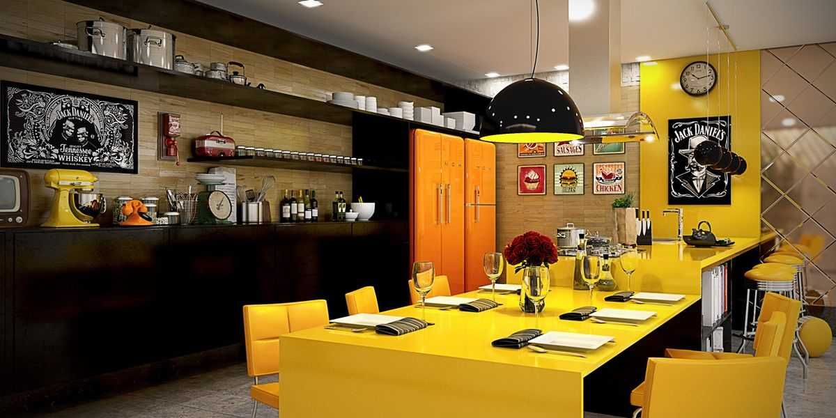 Классическая чёрная кухня с затемнённым оттенком жёлтого