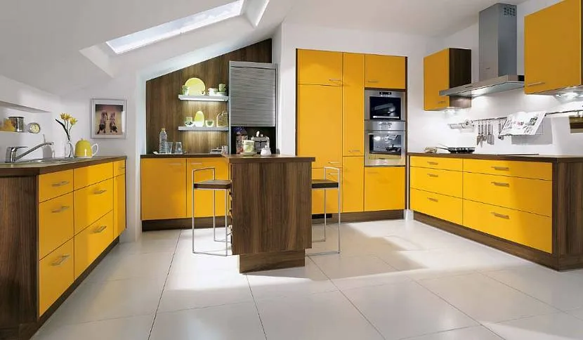 Желтая кухня в сочетании с коричневымИсточник obzorkuhni.ru/