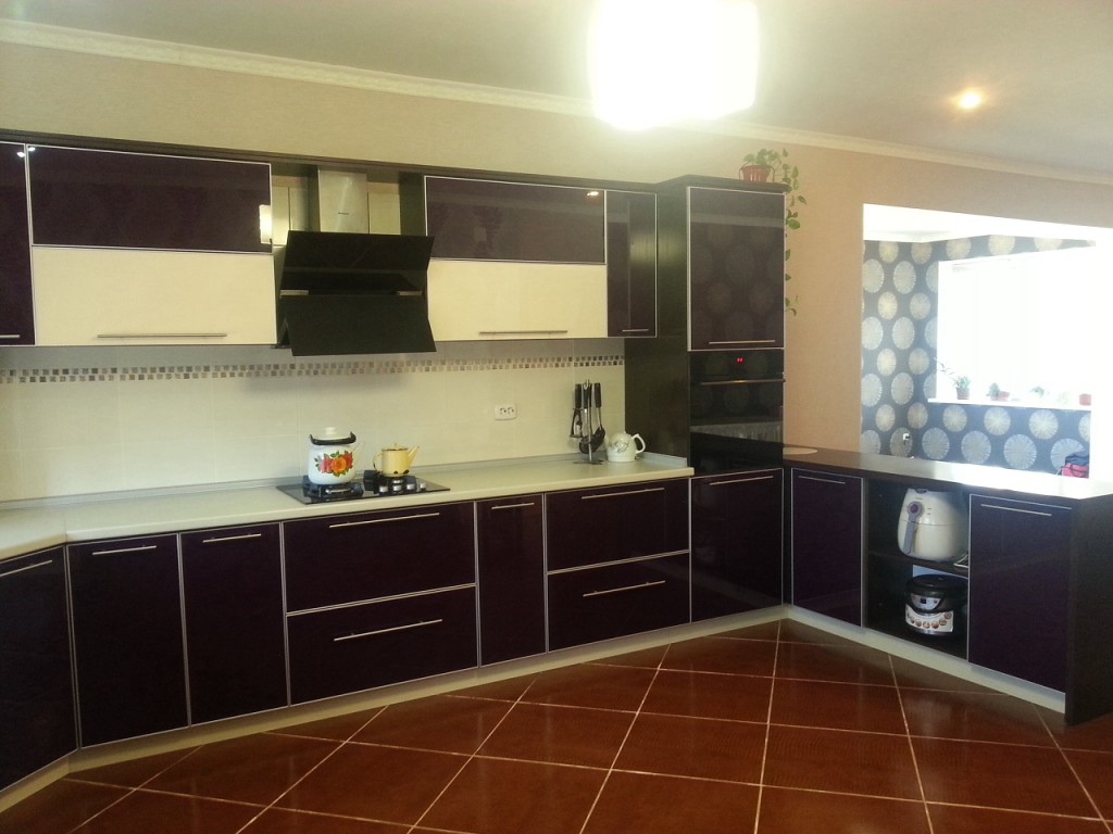 Хороший вариант такого гарнитура: выполненные из пластика глянцевые фасады, наличие алюминиевых профилей и другой фурнитуры цвета «металлик», зеркальный блеск всех поверхностей.