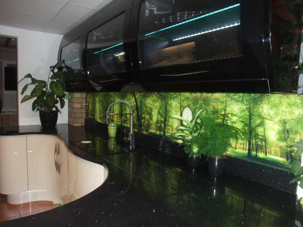 Столешница из черного стекла будет выглядеть очень привлекательно на современной кухне. Кроме того, она устойчива к высоким температурам, сильным моющим средствам, кислотам и влаге. К сожалению, при выборе стеклянной столешницы вы должны учитывать появление в дальнейшем неприятных полос, пятен и отпечатков, которые (особенно на черной столешнице) будут хорошо видны.
