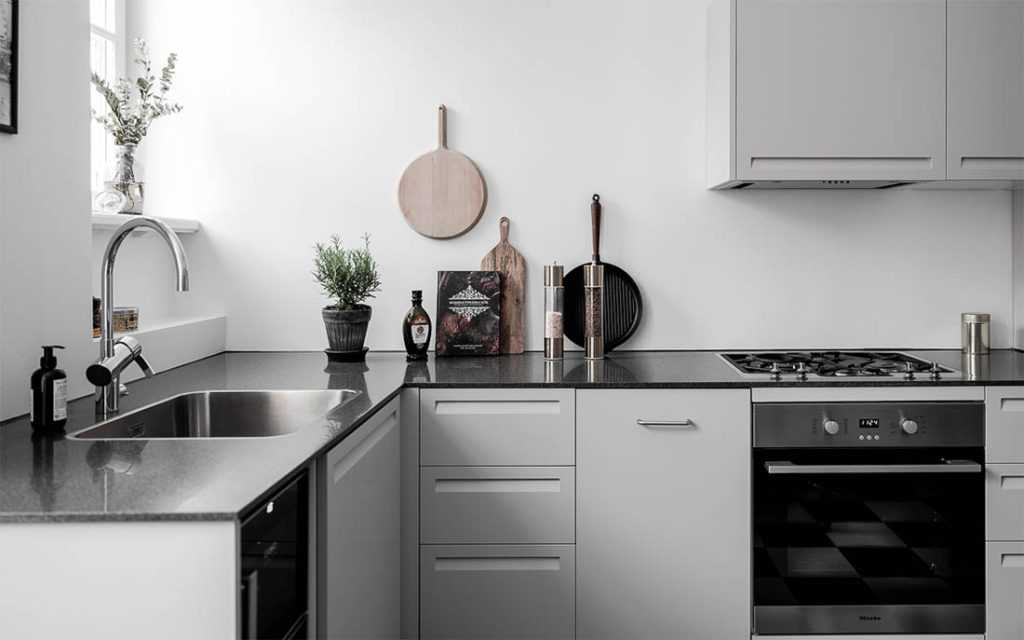 - Белая кухня и черная столешница. Лучший вариант для небольших помещений в скандинавском стиле. Черный цвет рабочей поверхности с глянцевой отделкой только подчеркнет светлое, теплое оформление.