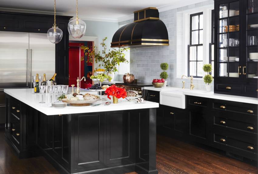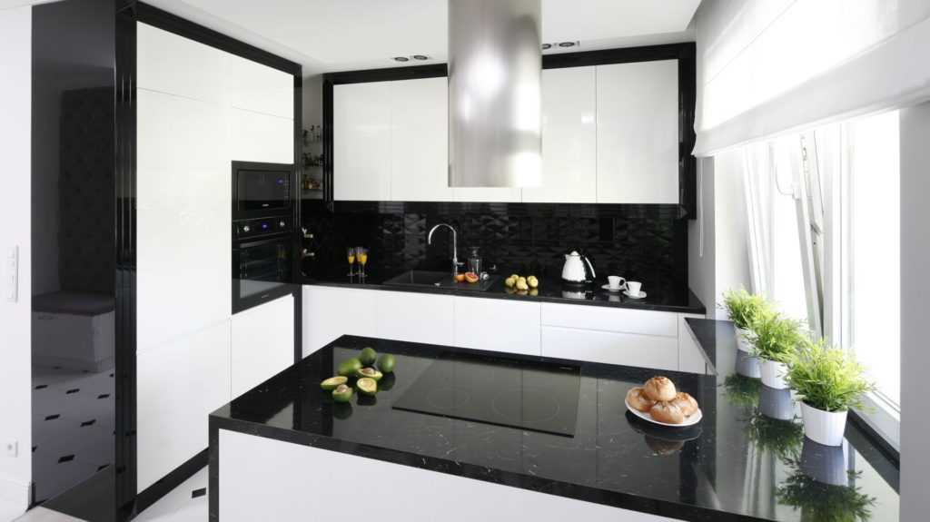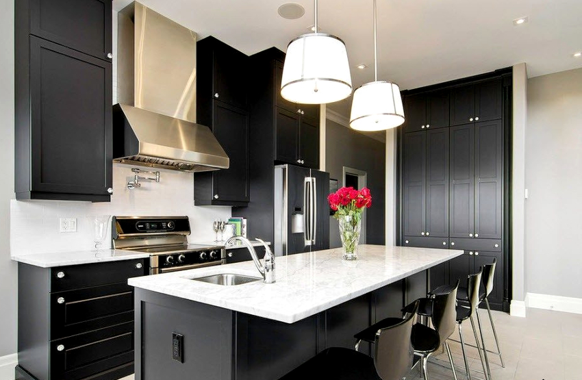 Чтобы придать черной кухне особый шик и изящество, столешница и фартук нужно выполнить в белом цвете. Сочетание черного и белого – вечная классика.