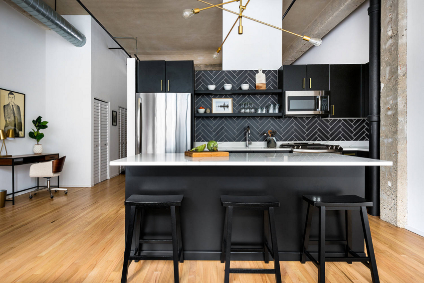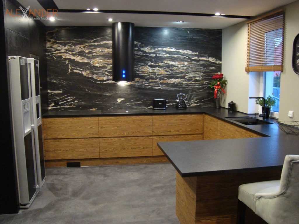 Черный, как и серый – универсальный цвет. Эта комбинация на кухне будет выглядеть необычно, но стильно и брутально. Лучше придерживаться строгих линий и разнофактурных материалов. Такой элемент интерьера будет сочетаться со многими стилями.