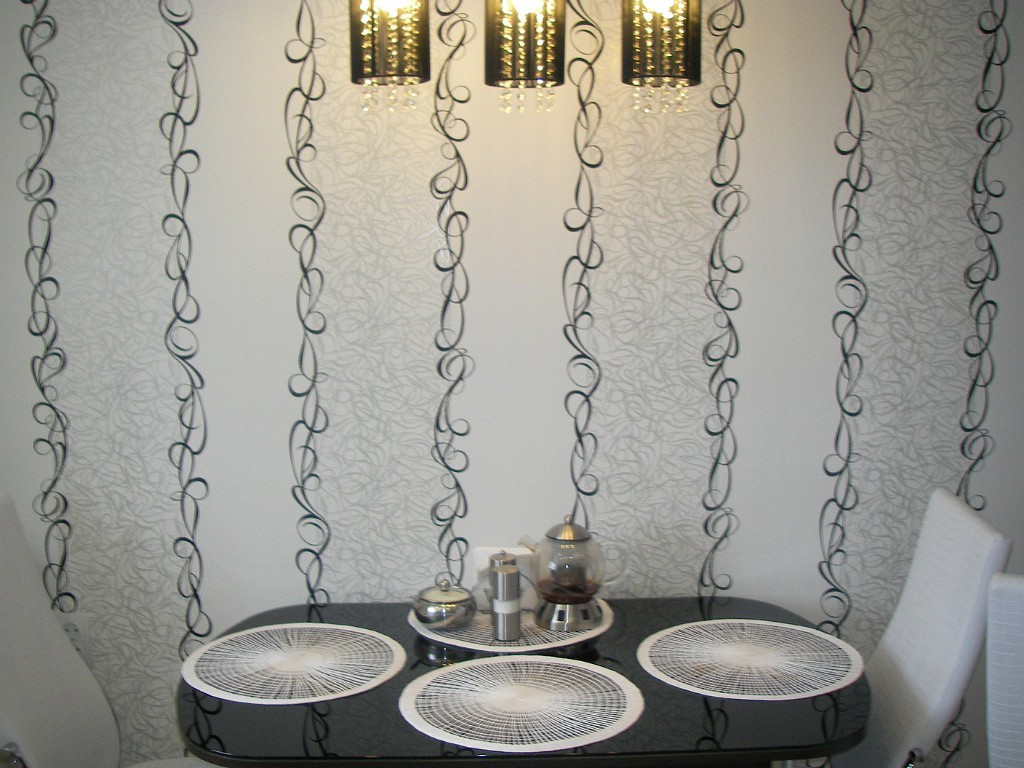 Стильные светлые обои с монохромной графикой или незамысловатым черным рисунком. При этом будет идеально, если они будут матированными либо с небольшим перламутровым отливом. Вместо них можно применить и другое замысловатое решение для черно-белой кухни – поклеить темные обои, на которых произведено нанесение светлого рисунка. Третьим способом можно считать оклейку черно-белыми обоями лишь одной стены, например, рядом с которой установлена кухонная мебель, а оставшиеся стены можно сделать контрастными — белыми или бежевыми.