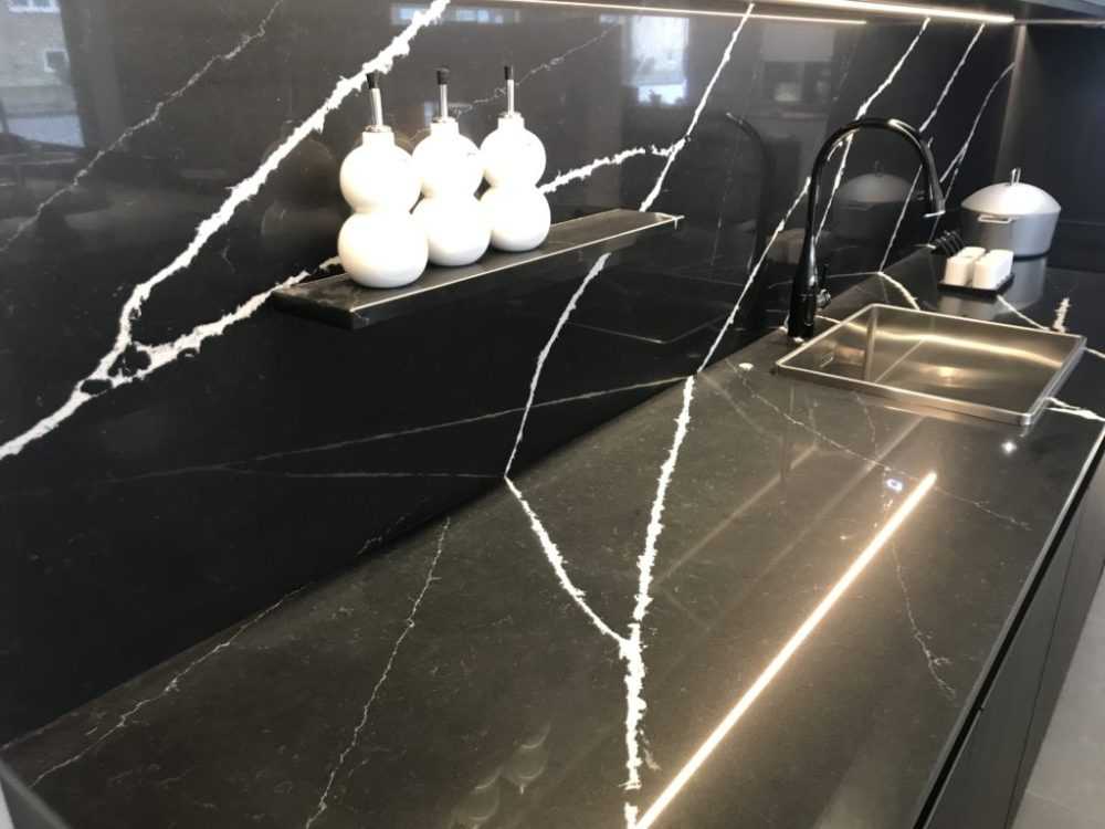 Черная столешница для кухни из агломерата выглядит так же хорошо, как сплошной каменный блок. Кроме того, столешница из агломерата теплее, чем неприятно холодный каменный блок.