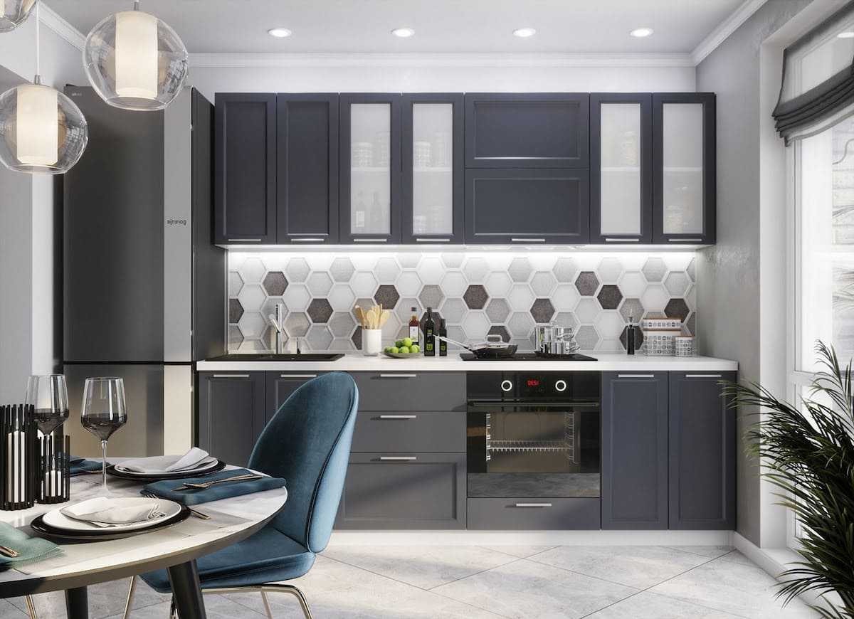Гарнитуры с темной столешницей и фартуком смотрятся особенно эффектно, если использовать контраст матового и глянцевого. Можно подобрать глубокие сложные цвета, например, темно-серый с синим подтоном.
