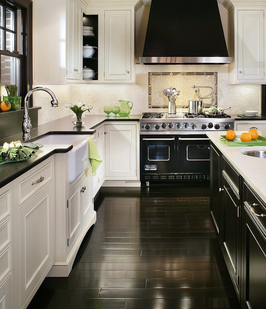 На пол в черно-белой кухне, как правило, производится укладка керамической плитки или керамогранита черного цвета. В тренде сейчас большие по размеру плиты. Для любителей натурального дерева или имитирующих его материалов подойдет как черный ламинат, так и темная практически черного или цвета венге массивная доска. Однако светлые материалы (например, светло-серого или бежево-песочного оттенка) можно не раздумывая укладывать на пол в черно-белом интерьере.