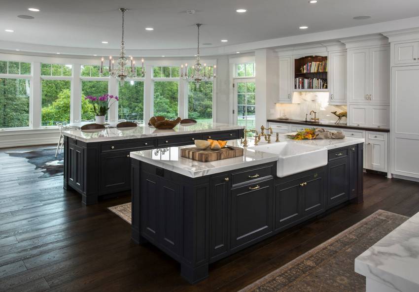 При выборе дизайна необходимо сразу определиться с доминирующим оттенком. Если фасады гарнитура чёрные, значит, пол и потолок должны быть светлого цвета и наоборот. Ещё один вариант — кухонная мебель с чёрным низом и белым верхом.