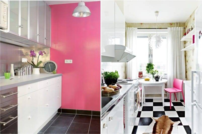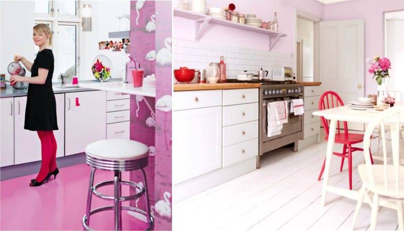 Карминовый либо наоборот нежно-розовый в сочетании с белым, черным или голубым, оранжевым – впишутся в интерьер кухни в стиле ретро или поп-арт как на этих фото.