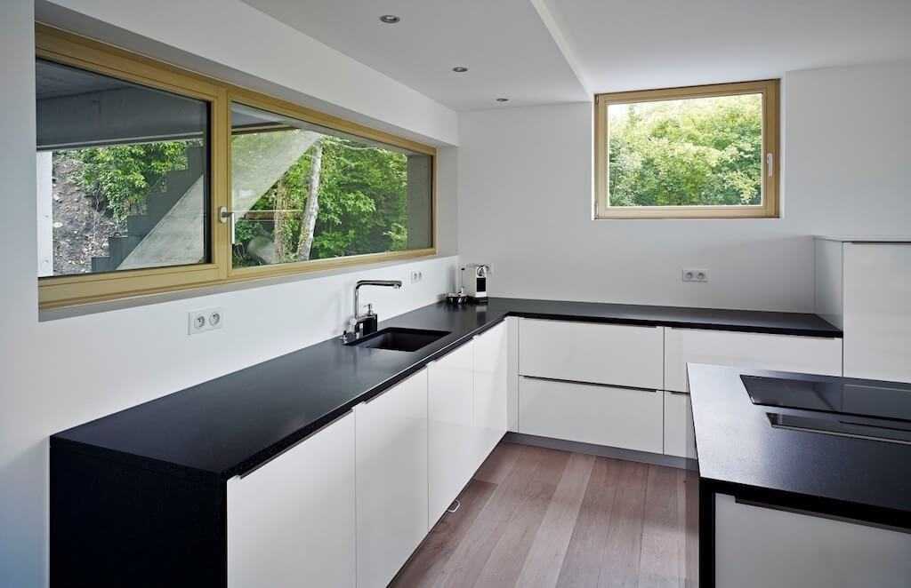 Обратите внимание, как черная столешница будто кромкой обтекает тумбы — очень стильное решение. Большие окна не занавешиваются тяжелыми окнами, а подчеркиваются тюлем