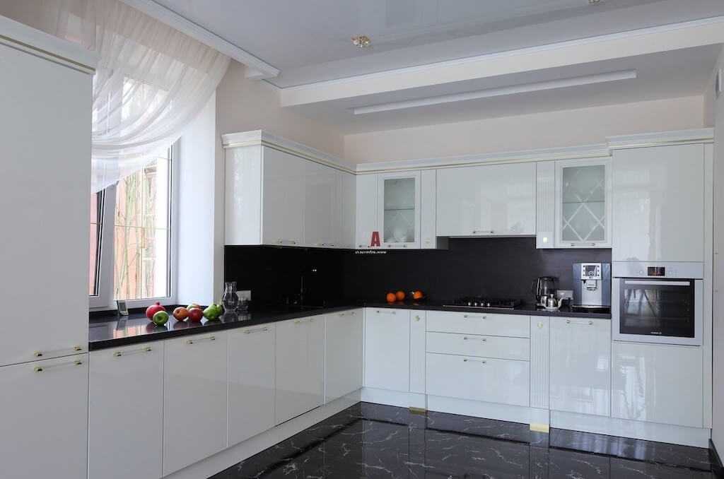 Чёрно-белое сочетание редко используется в традиционном классическом интерьере. Чаще его можно встретить в современной интерпретации классицизма. За основу гарнитура берут натуральную древесину или шпонированный МДФ. Одну часть мебели можно изготовить из выбеленного дерева, а вторую из тёмного венге. Фасады мебели должны быть матовыми, украшенные рамками, филенками, резьбой, стеклянными вставками с позолоченными окантовками, фурнитурой золотистого цвета. Золото прекрасно смотрится и на белой, и на чёрной поверхности. Интерьер классической кухни в чёрно-белом цвете можно увидеть ниже на фото.