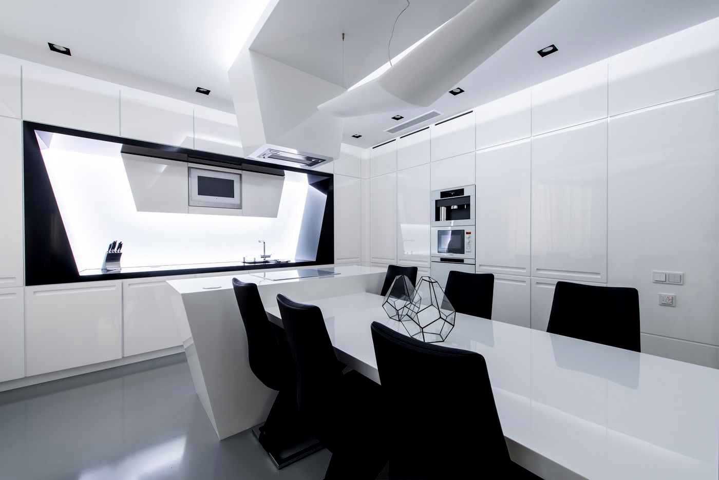 Шикарный интерьер кухни в стиле хайтек. Оформление в черно-белом варианте.
