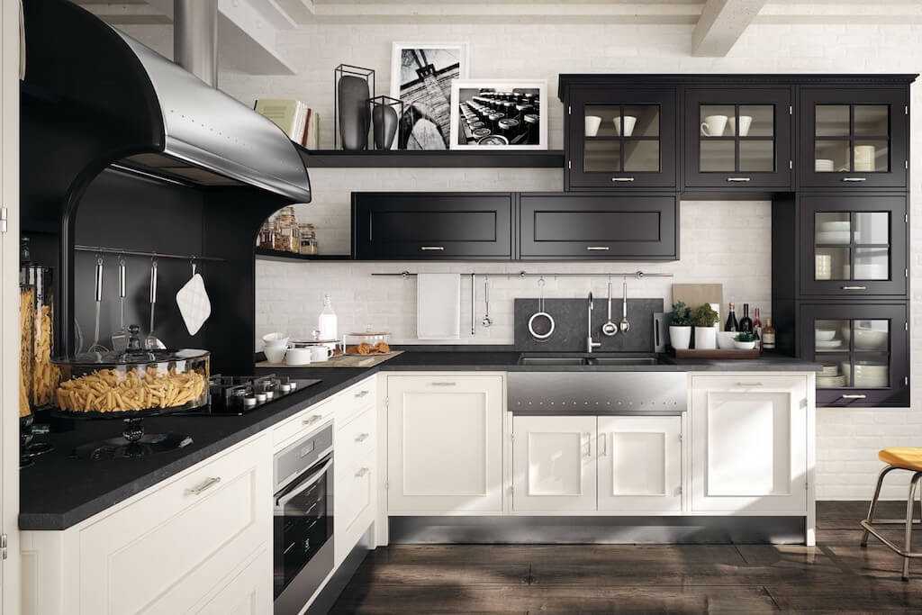Чтобы не создать ощущение тяжеловесности, выбирайте кухонные гарнитуры такие, где верхние шкафчики – белые, а нижние – чёрные или с чередованием этих двух цветов.
