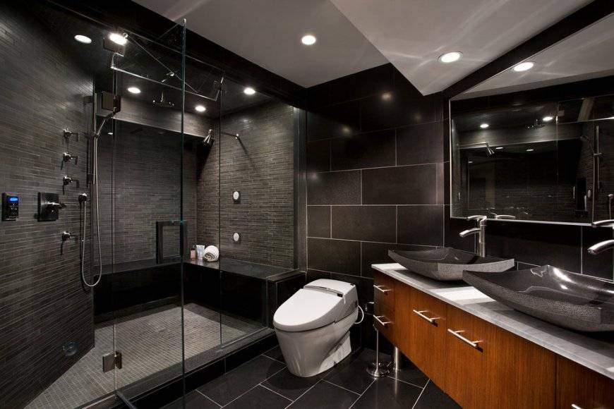 Облицовка черной плиткой выглядит элегантно и солидно, но необходимо учитывать, что черный цвет поглощает больше света, чем любой другой цвет. Стремясь создать роскошный интерьер с черной плиткой, с большой вероятностью можно получить в результате темное, унылое, навевающее скуку и депрессию помещение. Почему? Потому что в нем не будет хватать света и жизнерадостных красок. Это особенно касается маленьких помещений — таких как санузел.