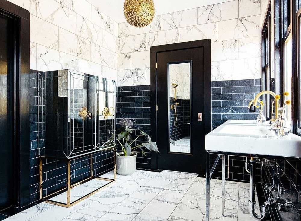 Арт-деко – это не классика, а утонченная современность, и данный пример доказывает подобное описание. Мрамор, золото, зеркальные детали и строгий черный цвет — основные черты дизайна, которые прекрасно сочетаются друг с другом.