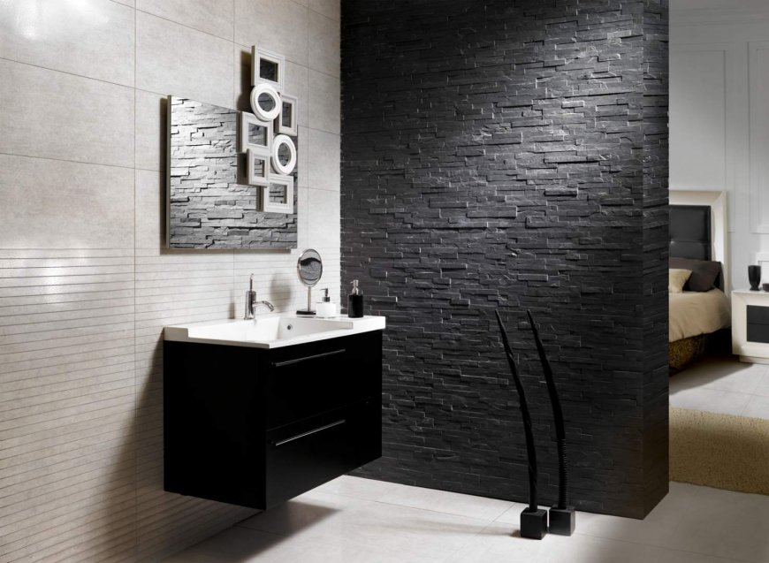 Если по ощущениям помещение маленькое, черной плиткой стоит отделывать не более одной трети площади поверхностей. Например, можно уложить черную плитку на пол и частично отделать ею стены, скомбинировав со светлой отделкой. Или положить на пол светлую плитку, а стены отделать черной плиткой на половину их высоты.