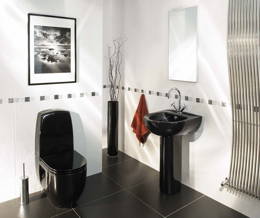Если в туалете или ванной комнате присутствуют черные элементы сантехники, важно, чтобы эту композицию разбавляли яркие акценты. Это могут быть различные аксессуары, например, вазы и статуэтки