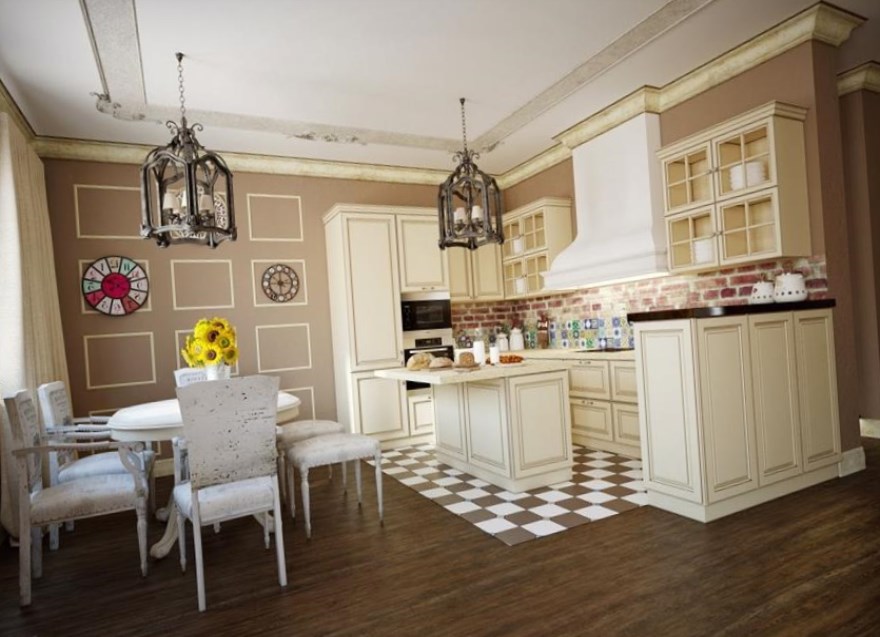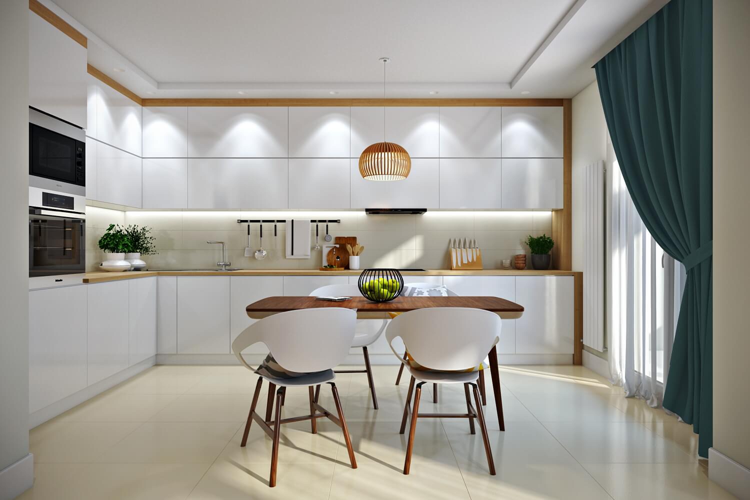 . Дневной свет должен падать на обеденную зону, а вечером зонировать кухню можно с помощью искусственного освещения. С этой целью используются бра и светодиодные встроенные светильники, которые монтируются в мебель или потолок. Для обеденной зоны предпочтительны люстры и светильники с мягким светом.