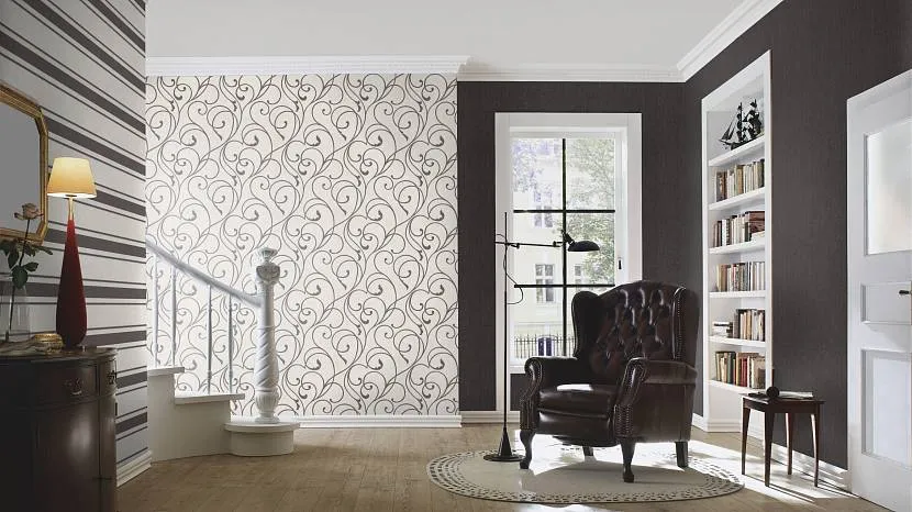 - Обои. Несмотря на то, что белые стены считаются идеальным фоном для черной мебели, в отделке можно использовать и разнообразные обои.