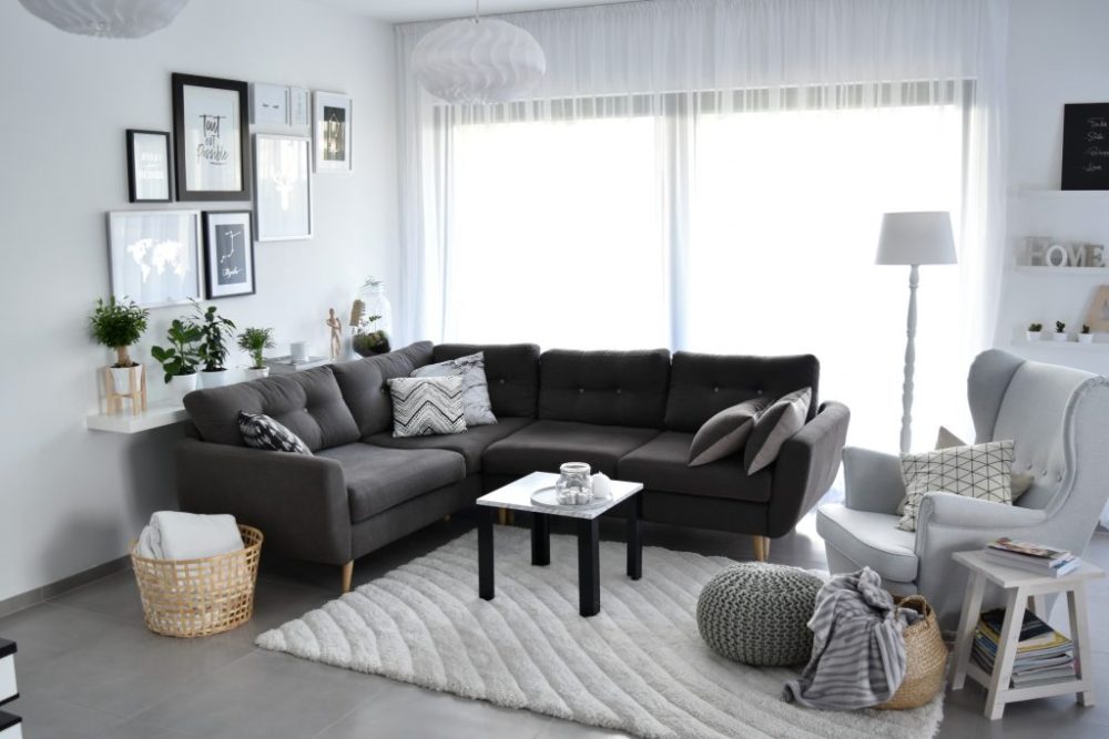 Если мы ставим диван серо-черный на фоне белой стены, мы получаем сильный эффект при небольшом количестве приложенных усилий. К этому стоит подобрать небольшое количество цветных добавок, таких, как скромная мебель и индустриальный пейзаж на стене и готов стильный интерьер.