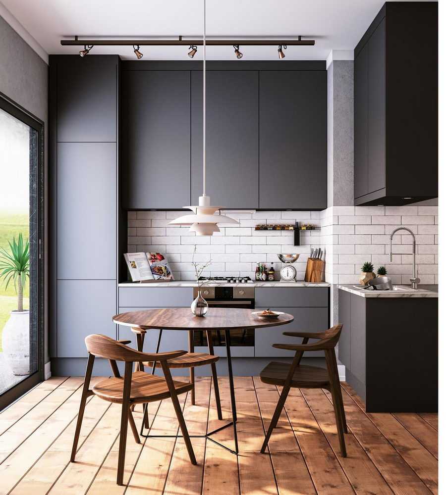 Черный имеет множество оттенков, которые хорошо видны при свете, поэтому перед выбором мебельного гарнитура для кухни стоит определится, будет ли это, например, сине-черный оттенок, черно-фиолетовый или черно-коричневый. Яркие фрукты на столе, насыщенного цвета полотенца, горшочки с зеленью будут удачно подчеркивать благородный тон гарнитура.