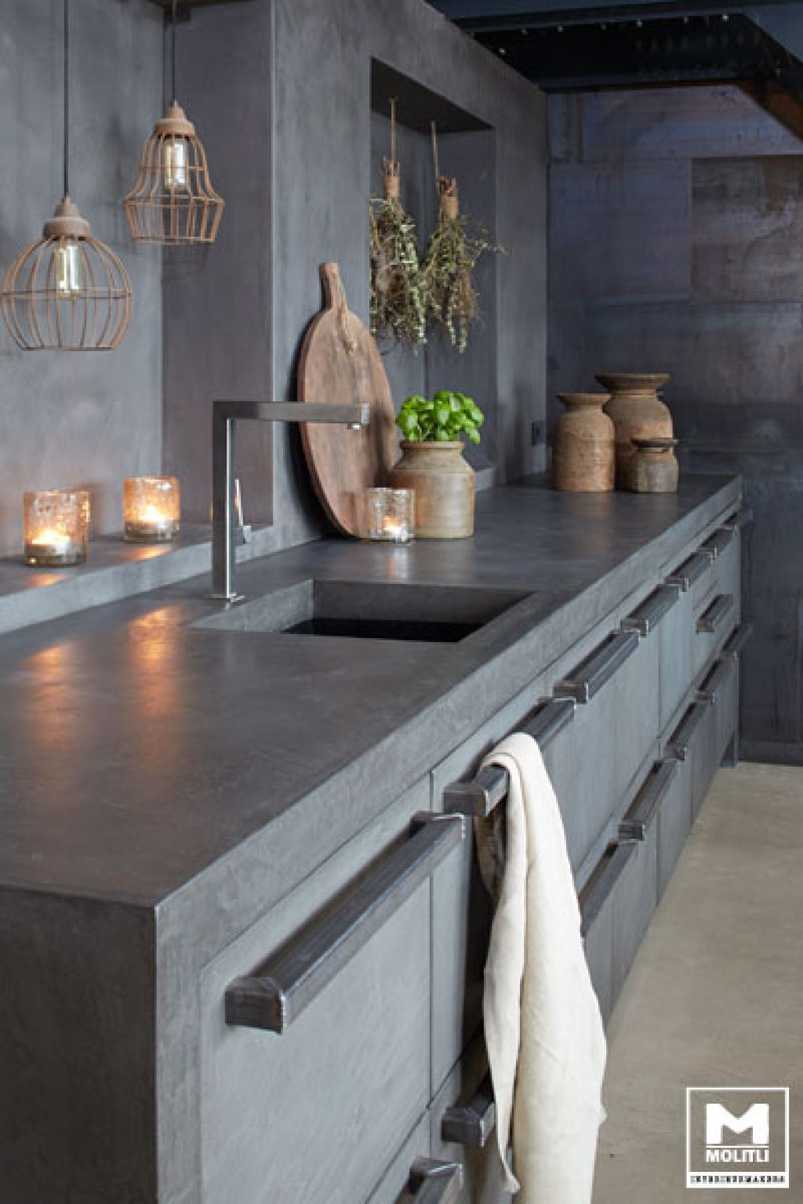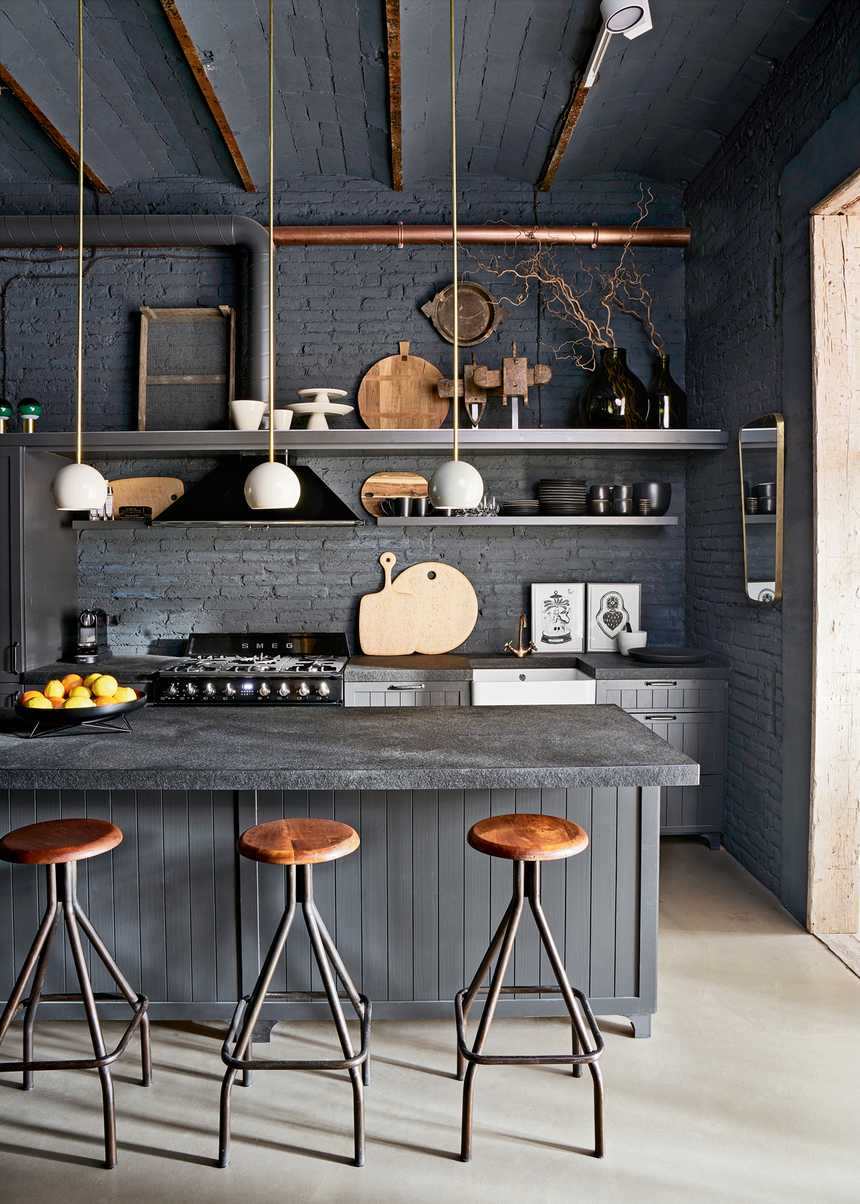 Металлическая столешница, например из нержавеющей стали или менее распространенного выбора, такого как цинк, олово или медь, будет намного выгодней выделяться с черными шкафами, так как они будут отражать много света.