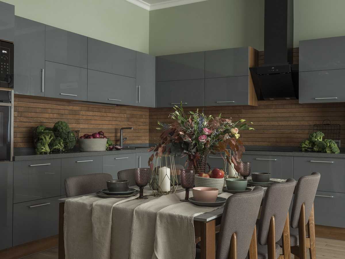 Кухня в зеленом цвете органично смотрится только в том случае, когда цвета-компаньоны грамотно подобраны и находятся в нужном соотношении к основному оттенку.