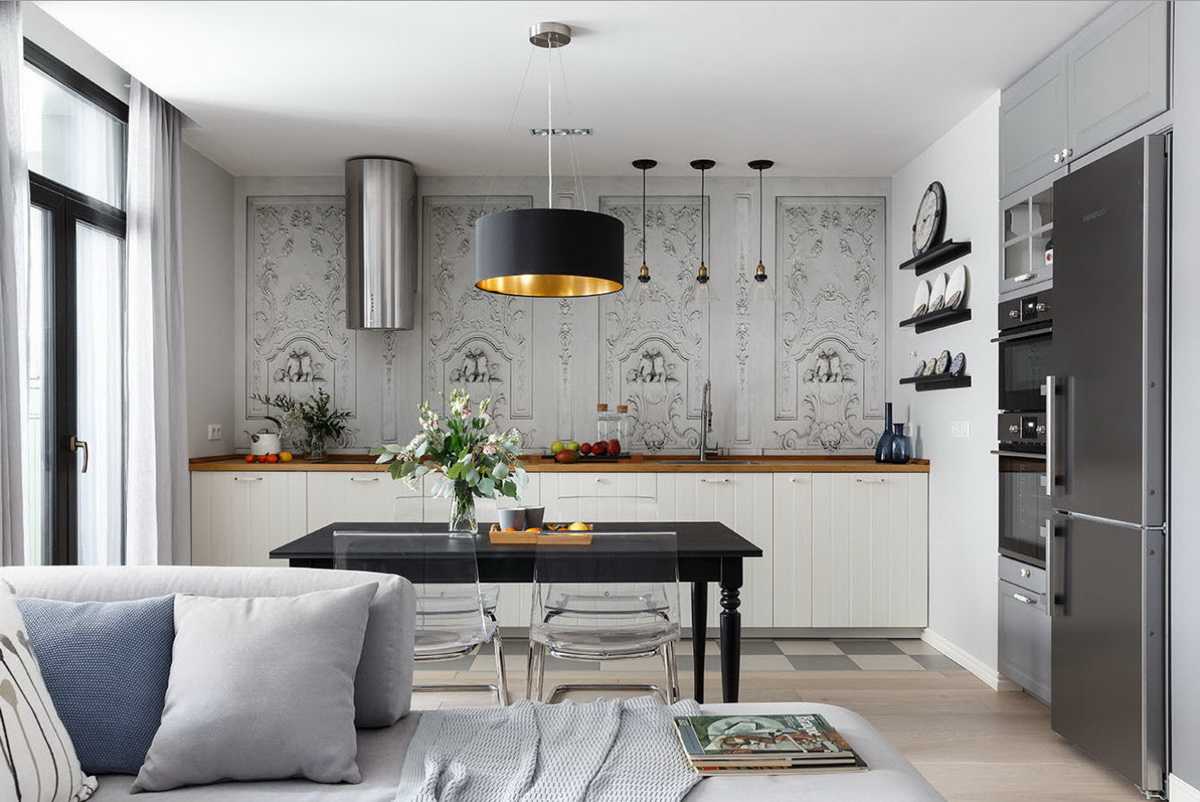 Выгодно подчеркивают мебель хромированные ручки, каменные столешницы и вставки из стекла, деревянный пол в сочетании с благородным черным смотрится презентабельно и стильно. Смягчит и придаст шарм дизайну люстра из хрусталя или стекла.